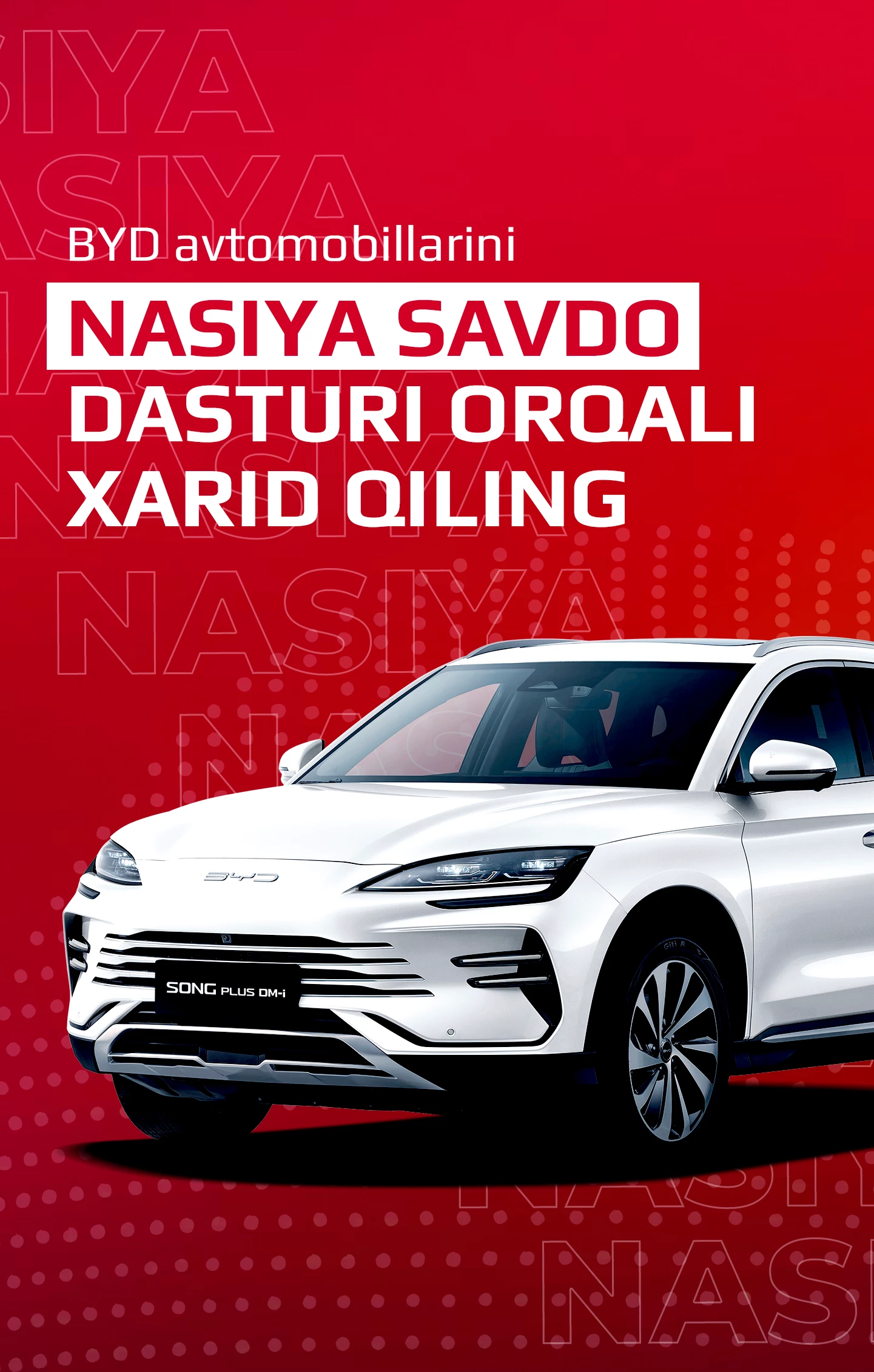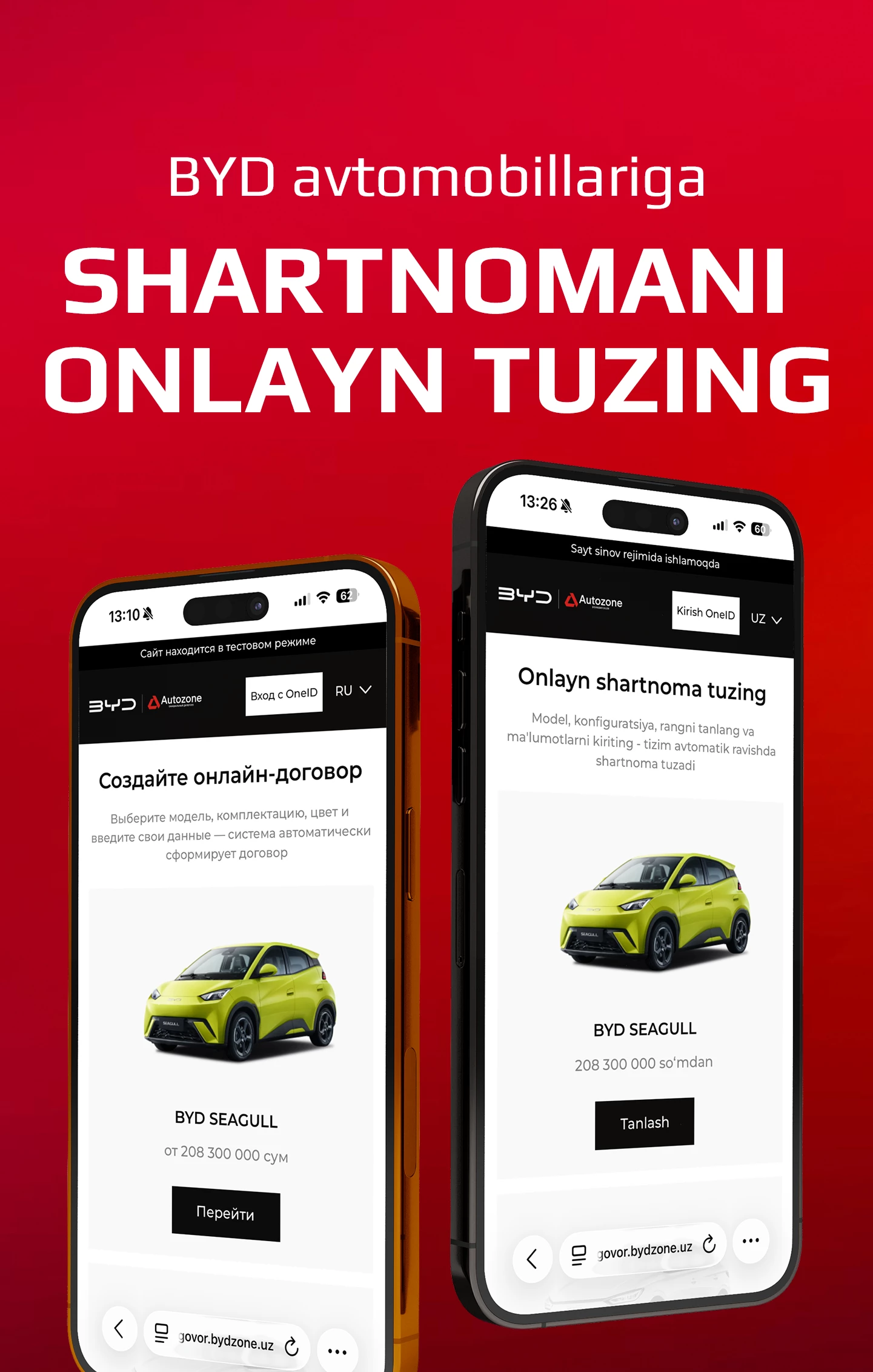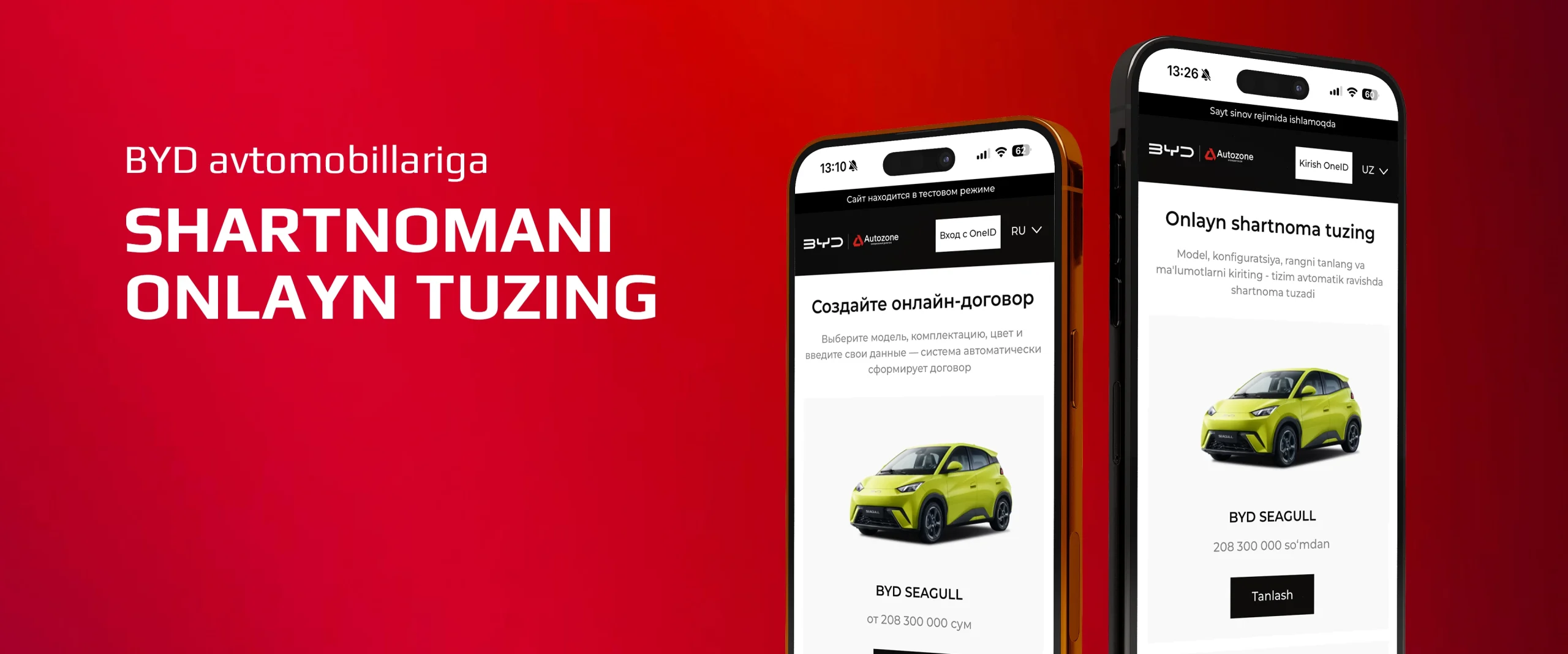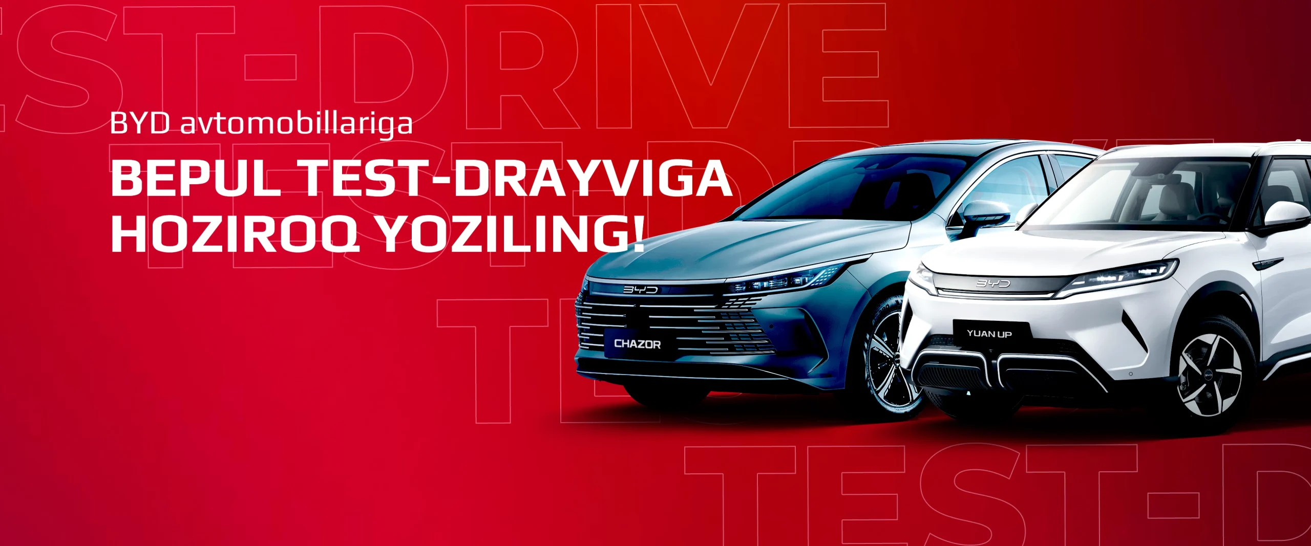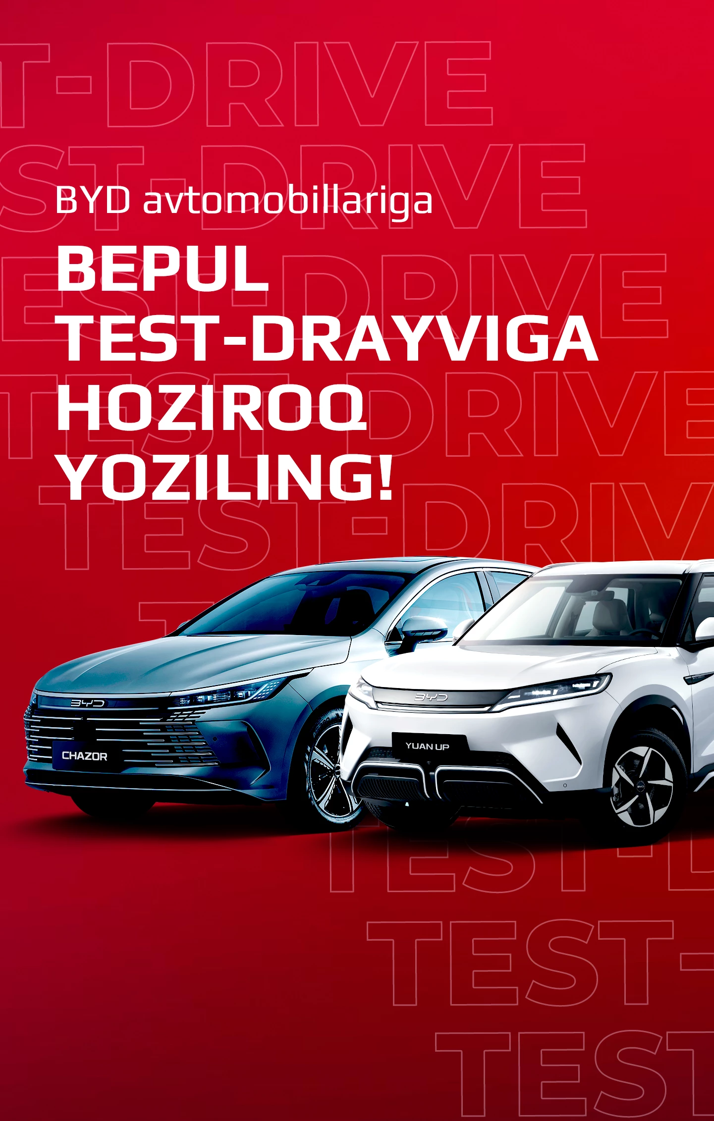 Test-drayvni onlayn bron qilish orqali BYD avtomobillarining kuchi va innovatsiyasini his eting. Noyob haydash tajribasiga sho'ng'ing va hozirda avtomobillarimizning qulayligi, xavfsizligi va ilg'or texnologiyalarini qadrlang. BYD bilan ajoyib haydash tajribasiga yo'lingizni aniqlang.
