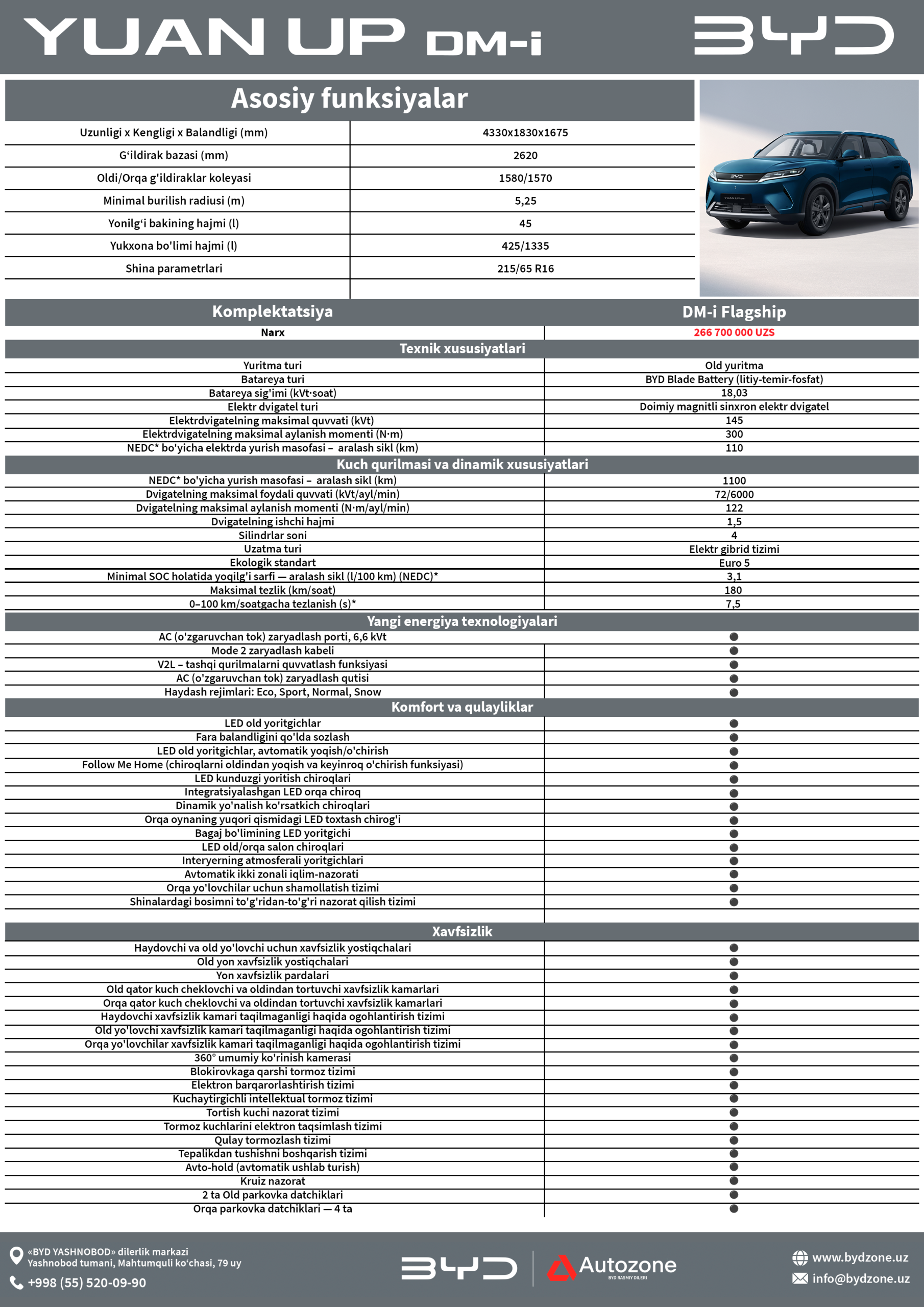 BYD YUAN UP DM-i yo'lda darhol e'tiborni tortadigan ko'rkam old dizayni bilan ajralib turadi. O'lchamlari jihatidan ixcham bo'lsa-da, xarakteri va ko'rinishi jihatidan juda ta'sirchan.